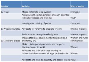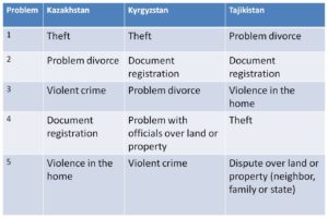 The research was interested to note that the problems across the three countries were very similar with theft, problem divorce (a divorce during which there is dispute over children or property), document registration, violence in the home and disagreements over property