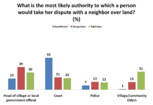Similar profiles of answers were provided in other scenarios. Generally only Kazakhstan had a majority of respondents resolving significant disputes in the courts. In Kyrgyzstan and Tajikistan it was more likely that respondents would take their disputes to the head of the village or a tribal court.