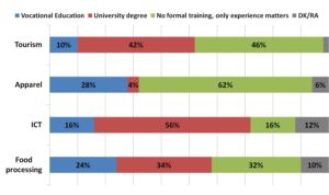 As one can see from the table above, the experience of potential employees is more in-demand from companies than formal education. This is true for all sectors, but particularly in apparel and food processing.