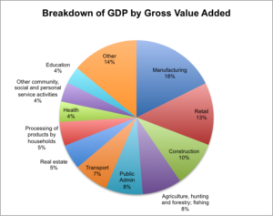However, manufacturing industry dwarfs most other sectors. In 2013 it was worth 11% of GDP, and made up approximately 16% of formal employment and around 30% of exports. Only the “trade” (mostly small retail shops) sector was larger.