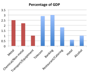 If one looks at the sub-sectors, the numbers are similarly impressive. “Metal and metal products” was worth 2.5% of GDP. “Chemical and non-metal mineral products‟ (mostly fertilisers and cement) was worth 2.2% of GDP. This makes both of these subsectors roughly the same size as the entire telecommunications sector (worth 2.9% of GDP) or banking (worth 3%) and makes both sub-sectors far more valuable than the entire restaurant and catering sector (worth 1.8%) or the hotel sector (worth 0.6%). Another manufacturing sector, that of “transport and manufacturing equipment” (worth 1% of GDP), was roughly the same size as manufacturing of alcoholic beverages- including wine (also 1%).